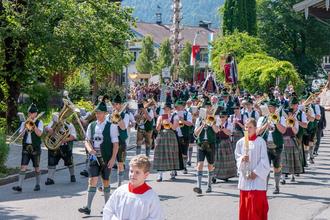 Unterwössen - Zum Hochfest Fronleichnam feierte die Pfarrgemeinde Unterwössen einen festlichen Gottesdienst in der Pfarrkirche St. Martin. Eine würdige Prozession durch den Ortsteil schloss daran an. Die Unterwössner Vereine beteiligten sich, die Musikkapelle und der Kirchenchor sorgten für feierliche Musik. Zahlreiche Gläubige, Familien und Gäste begleiteten den Zug durch die Straßen.
