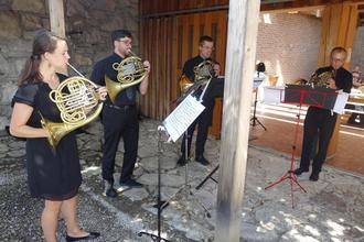 Reit im Winkl – Herzlichen Beifall erhielt die „Chiemgau Horn Connection“ bei der Bergkirchen-Andacht im Innenhof der Kirche St. Johann im Gebirg auf der Winklmoos-Alm. Korbinian Kebinger, Sebastian Krause, Joseph Schillinger und Katharina Waldherr spielten auf ihren Waldhörnern meisterhaft Werke von Franz Strauss, Felix Mendelssohn-Bartholdy und Werner Pirchner.