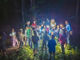 Inzwischen war es dunkel und erkennbar: Ein paar Schritte in den Weg hinein war es im Wald stockfinster. Nach kurzer Überwindung klickten die Taschenlampen und Stirnlampen an und hinein ging es in das finstere Abenteuer. Da war dann schon ein mulmiges Gefühl. Aber immer weiter ging es in den dunklen Wald. Und jetzt? Ein Lampion am Baum, ein gutes Stück weiter der nächste. Sollten sie es wagen, den bequemen Weg zu verlassen, noch tiefer in die Finsternis hinein?