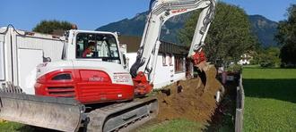 Im Außenbereich werden die Grundleitungen und die Kanalinfrastruktur neu verlegt. Außerdem wird die Verbindung mit der Nahwärmeleitung des Schulhauses vorbereitet.