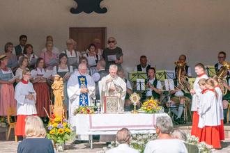 Unterwössen – Bei strahlendem Sonnenschein und hohen Temperaturen feierten zahlreiche Gläubige am Donnerstagvormittag den feierlichen Festgottesdienst zu Mariä Himmelfahrt im Unterwössner Kurpark. Der Blick auf die leeren Bänke vor dem Musikpavillon täuschte. Die Gottesdienstbesucher verfolgten aus dem Schatten der großen Bäume des Kurparks aufmerksam dem Geschehen. Musik, Gebet und eine besondere Atmosphäre bestimmten diesen bedeutenden Feiertag im bayerischen Kirchenjahr.