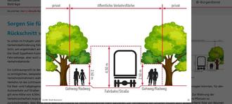 Wir bitten alle Grundstückseigentümer mit Grundstücken an Straßen, Wegen und Plätzen, das Lichtraumprofil für den Straßenverkehr freizuhalten, um Schäden von sich selbst und von anderen abzuwenden. Das Lichtraumprofil ist für Gehwege, Radwege und Fahrbahnen von jeglicher Beeinträchtigung freizuhalten. Darunter fallen auch Bäume und Sträucher, deren Äste in das Lichtraumprofil hineinragen. Die Eigentümer, deren Grundstücke an den Verkehrsraum angrenzen, werden gebeten, den Bewuchs dahingehend zu prüfen.