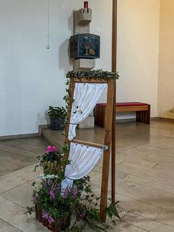 Unterwössen. In der zu Mariä Himmelfahrt gut besuchten Kuratiekirche in Oberwössen erfreute einmal mehr ungewöhnlicher Kirchenschmuck die Besucher des Gottesdienstes mit Pfarrer Dominik Bartsch. Im Altarraum stand ein hoher, senkrecht geteilter Fensterrahmen aus Holz und bildete ein optisches Gegengewicht zum Ambo auf der anderen Altarseite. Beides, Ambo und Fensterrahmen waren mit Kräutern geschmückt. Aus dem Arrangement am Ambo fiel vor allem die hohe Königskerze auf. In den beiden Fensterausschnitten des Rahmens hingen seitlich drapiert weiße Gardinen.