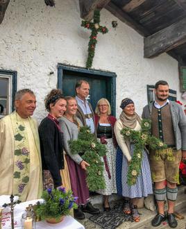 Auf der Jochbergalm freuten sich Pfarrer Anderl Ager (von links) und die Almleute über eine Bergmesse und einen Almkirta in besondere Atmosphäre. Simone und Hanna bewirtschaften für den Oberwidholz-Hof. Anton und Petra Götschl arbeiten auf dem Mesner Kaser, vor dem das Foto entstand. Die Alm des Unterwidholz betreuen Simone und Josef. In der Bergmesse weihte Pfarrer Ager die gesteckten Kreuze der Almkaser.