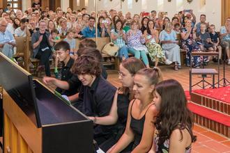 Da wusste das Publikum nicht mehr an sich zu halten im dröhnenden Applaus. Acht junge Pianisten, 16 Hände an einem Klavier und einem Flügel, ließen es in der „Polka Concertata“ von Paolo Canonica so richtig krachen.