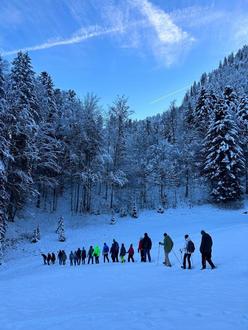 Auch wir vom Achental Tourismus haben die Band dieses Jahr mit dem Rahmenprogramm rund um die Heimatkonzerte unterstützt: Auf einer Rauhnachtswanderung auf dem Schmugglerweg in Schleching durften wir den 26 Teilnehmern aus ganz Deutschland die alpenländische Tradition und die Mystik rund um die Rauhnächte und die Region näherbringen.
