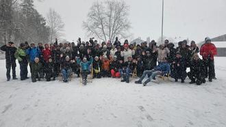 Gruppenbild: Die Achental Meisterschaft war ausgebucht. Zwölf Moarschaften traten auf der Oberwössener Natureisfläche bei dichtem Schneetreiben gegeneinander an. Am Schluss waren alle Sieger.