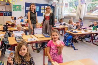 Unterwössen. Zum gelungenen Schulstart der Kinder in der 1. Klasse der Grund- und Mittelschule Unterwössen wollte auch die Kreissparkasse Traunstein-Trostberg beitragen. Sie entsandte ihre Kundenberaterin Claudia Brandstetter (rechts) aus der Geschäftsstelle Marquartstein. Nach der großen Pause besuchte sie die 1. Klasse mit Lehrerin Simone Galmbacher (links) und brachte für jedes Kind einen Umschlag mit gleichem Inhalt. Gleich nachgeschaut, fand sich darin neben Stundenplan und Luftballon ein schickes Schlauchtuch, welches auf vielfältige Weise getragen werden kann.