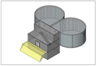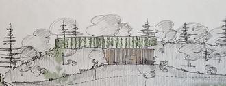Grafische Darstellung des neuen Hochbehälters. Die Einbettung in die Landschaft wird unten stehend im „Gestaltungsentwurf mit einer teilweisen Überdeckung“ gezeigt (Entwurf Büro Dippold + Gerold)