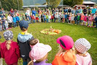 Unterwössen. Es war ein schöner Herbstmorgen, als die Kinder des Katholischen Kindergartens St. Martin ihren Erntedank feierten. Auf dem benachbarten Fußballplatz war ein Kreis mit Feldfrüchten ausgelegt, Die große Anzahl an Kindern der nun vier Gruppen auf ihren Bänken bildete einen großen Kreis. Darum, ebenfalls im Kreis, standen Eltern, Großeltern und Geschwister.