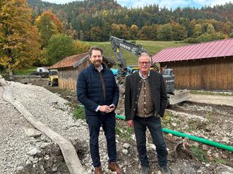 Erster Bürgermeister Ludwig Entfellner (rechts im Bild) und Zweiter Bürgermeister Johannes Weber machen sich vor Ort ein Bild über die derzeit laufenden Maßnahmen des Wasserwirtschaftsamtes Traunstein in Hinterwössen.