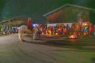 Unterwössen - Dunkelheit liegt über dem großen Spielplatz an der Taubenseestraße, als sich am Montagabend der Martinsritt in Oberwössen formiert. Das Wetter ist trocken, die Temperaturen kühl, aber nicht kalt. Kinder halten ihre Laternen, das Licht tanzt auf den Gesichtern. An der Spitze steht ein mächtiger weißer Schimmel. Auf seinem Rücken sitzt die junge Reiterin Eva Aigner aus Kössen. Sie spielt den Heiligen Martin. Hinter ihr tragen Ministranten einen leuchtenden Stern. Der Zug zieht los - über die Taubenseestraße, weiter über den Gries in Richtung Hinterwössen.