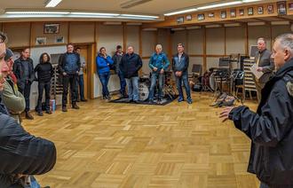 Ager beschreibt anschaulich vor Ort, wie Musikantinnen und Musikanten, dazu das Equipment an Notenständern und Instrumenten, auf engstem Raum aufeinander hocken. Die druckvolle Musikkapelle ist dabei in dem kleinen Raum mit seiner niedrigen Decke und fehlenden Schallschluckelementen so laut, dass gerade ältere Musikanten das kaum aushalten. Die fehlende Akustik erschwert es sehr, sich und den Mitmusikanten herauszuhören, wichtiges Element im Zusammenspiel, beschreibt Ager. Der Zugang zum Probenraum führt über eine einzige Treppe ins Untergeschoss, ein weiterer Fluchtweg wäre sinnvoll. Edi Ager unterstreicht: Es ist keinesfalls der Wunsch der Musikanten, da „etwas über das Bein zu brechen“. Sie wünschen sich, dass Fachleute sich der Situation annehmen, um gemeinsam mit der Gemeinde und den Musikanten eine Lösung zu finden.
