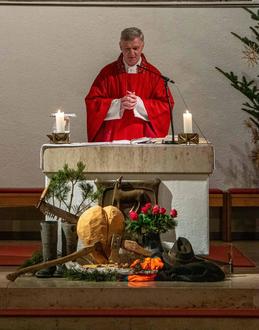 Den besonderen Gottesdienst unterstrich der so schlichte wie schöne Kirchenschmuck. Der mächtige Christbaum war nur mit Strohsternen geschmückt. Am Fuße des Altars waren im Grün der Daxen typisches Werkzeug, wie eine mächtige alte Säge und die Hacke der Holzarbeiter, die Sappie, zu sehen.