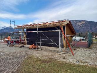 An der Ostseite wurde ein Schleppdach angebaut, das auch als Überdachung für die neu angebrachte Kletterwand dienen soll.