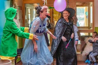 Und dann ging es in ein wunderbares Spiel der verkleideten Erzieherinnen, die wirklich alles gaben. Eine Stunde Grimms Märchen im Schnelldurchlauf. Lachend und feixend tanzte Michaela Windbichler im Kreis, bis die Kinder verrieten, dass sie Rumpelstilzchen heißt.