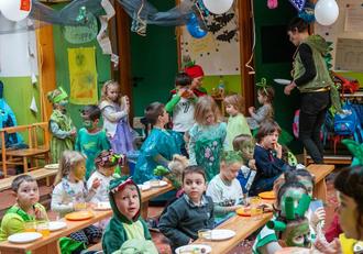 Es war Halbzeit in einem unvergesslichen Kindergartentag, der mit Spielen und Tänzen in den Kindergartengruppen der grün verkleideten Kinder und Erzieherinnen begann und auch nach dem Büfett so weiter ging. Wieder einmal kamen die Eltern viel zu früh, die Kinder abzuholen. Wie gern wären die noch geblieben.