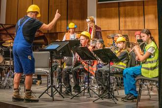 Das Kinder- und Jugendorchester, das als Bauarbeiterensemble auftrat, sorgte für eine energiegeladene Interpretation moderner Klassiker. Mit „The Final Countdown“ und „Born to be Wild“ brachten sie frischen Wind in die Halle. Besonders das Zusammenspiel der Schlagzeuger und Bläser ließ das Publikum spüren, wie viel echtes Teamwork und Übung dahinterstecken.