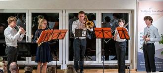 Mit dabei ist das Brass Quintett, im wesentlichen Jahrgang 2005, 2006, aus Ludwig Müller, Thaddäus Kink, beide Trompete, Magdalena Baumgart, Horn, Lukas Auer, Posaune, und Anton Kluger, Bassposaune.