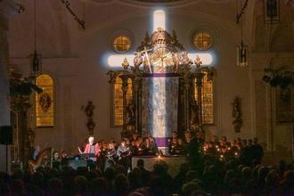 Unterwössen. Einen so grandiosen wie anrührenden Abend bescherte der Salzburger Josef Radauer mit rund 80 Mitwirkenden in seinem Salzburger Passionssingen 2023 „In Paradisum“. Die Besucher in der ausverkauften Pfarrkirche St. Martin dankten es ihm mit Begeisterung aber ohne Applaus - den hatte sich Radauer schon im Beginn verbeten.