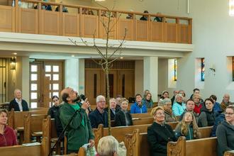 Der Grassauer Chor Charisma unter der Leitung von Monika Buchner sorgte mit flotter, moderner Kirchenmusik für einen lebendigen Auftakt und besondere Stimmung. Im Mittelgang stand auf einem Hocker ein mannshohes Bäumchen – kahl, so wie es die Jahreszeit mitbringt. Stefan Steinbacher, in der Kirche engagiert und von Beruf Gärtner, begann ein Zwiegespräch mit dem Baum. Er sprach über das Leben heutiger Jugendlicher, das geprägt ist von Unsicherheiten, Reizüberflutung durch das Internet und Bedrohungen in der Welt. Antworten fand er keine. „Was soll ich mit dir tun? Du siehst auch nicht gerade gut aus“, sagte Steinbacher in Richtung Baum. Doch er schloss mit einem hoffnungsvollen Satz: „Wir versuchen es. Aber du musst schon ein wenig mittun.“ Den Bogen zur Botschaft des Evangeliums schlug er mit den Worten: „Die Situation der heutigen Jugend ähnelt vielleicht mehr dem Leben Jesu, als wir denken. Aber davon erzählt euch nun der Pfarrer.“