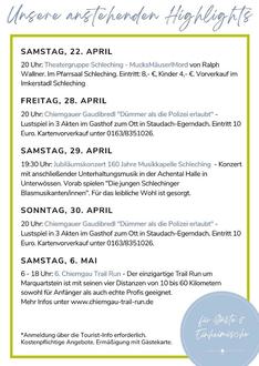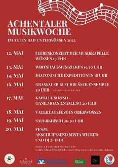 Traditionell starten die Achentalgemeinden Mitte Mai alljährlich mit Jahreskonzerten und Standkonzerten in die Musiksaison. Dieses Jahr präsentiert die Gemeinde Unterwössen im Alten Bad erstmalig vom 12. Mai - 20. Mai 2023 die Achentaler Musikwoche mit einem bunten musikalischen Programm mit verschiedenen Akteuren aus der Region.