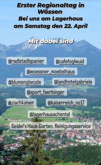 Der Wössner Wirtschaftsverband veranstaltet daher am 22.04.2023 erstmalig den Wössner Regionaltag. Auf Nachfrage von „Servus Achental“ hatte Martin Nieß die Idee, die Wössner Geschäftswelt alle auf einem Platz (in dem Fall auf dem Gelände des Spiel- & Gartencenter Achental) zusammen zu bringen und mit Ihnen eine Art „Gewerbeschau bzw. Leistungsschau“ mit aktuellen Trends, Neuheiten und vor allem mit ganz besonderen Angeboten zu inszenieren.