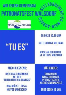 In einer gemeinsamen Sitzung des Seelsorgebereichsrates und des PGR Lisberg-Walsdorf wurde ein besonderes Highlight vorbereitet: Am Sonntag 25.06. sind um 10:30 Uhr alle zu einem Gottesdienst auf der Wiese neben St. Petrus Walsdorf eingeladen. (Die weiteren 10 Uhr oder 10:30 Uhr-Gottesdienste im Seelsorgebereich entfallen deswegen.) Die Walsdorfer feiern dabei ihr Patronatsfest und freuen sich, wenn viele aus dem Seelsorgebereich mitfeiern. Nach dem Gottesdienst gibt es leckeres Essen und Trinken, Unterhaltungsmusik und ein buntes Programm für Kinder. Näheres siehe Plakat. (Zur kath. Kirche in Walsdorf fahren Sie in der Ortsmitte Richtung Burgebrach und biegen dann links in den Mühlweg ab.)