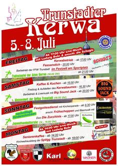 der Verein Heimatliebe Trunstadt - Kerwasburschen und Kerwasmadla e. V. freut sich euch, zusammen mit den Trunstadter Ortsvereinen, das folgende Programm für das Kirchweihwochenende vom 05. Juli bis 08. Juli 2024 präsentieren zu dürfen: