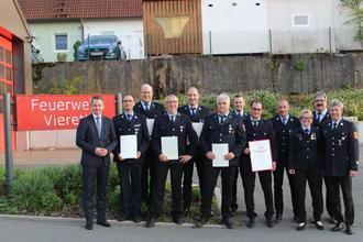 v.l.n.r: Johannes Maciejonczyk (w. stv. Landrat), für 25 Jahre: Marco Wilda, Holger Birklein, Andreas Nüßlein, Stefan Hartmann, Klaus Nastvogel (für 40 Jahre), Jakob Grimm (stv. Kommandant), Tobias Schmitt (THL gold-rot), Michael Klesse (Vorsitzender), Feli Kroll (stv. Vorsitzende), Huber Ebitsch (stv. Bgm), Andreas Schnapp (KBI)
