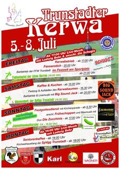 der Verein Heimatliebe Trunstadt – Kerwasburschen und Kerwasmadla e. V. freut sich euch, zusammen mit den Trunstadter Ortsvereinen, das folgende Programm für das Kirchweihwochenende vom 05. Juli bis 08. Juli 2024 präsentieren zu dürfen:
