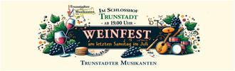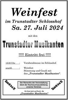 Am Samstag, 27. Juli, veranstaltet die „Fränkische Blaskapelle Trunstadt e.V.“ ihr diesjähriges Weinfest im historischen Schlosshof Trunstadt. Die Vorabendmesse findet um 18 Uhr im Freien statt. Nach kurzer Umbauphase werden die Musiker um ca. 19:30 Uhr, dass über die landkreisgrenzen hinaus bekannte Weinfest eröffnen. Wir „Trunstadter Musikanten“ präsentieren hierbei unser beliebtes und bewährtes Stimmungsprogramm. Für gute Laune sorgen deshalb bekannte Schlager, Oldies aber auch Alpenrock und aktuelle Chart-Hits, welche im Winter und Frühjahr erarbeitet wurden. Den Besuchern werden neben dem reizvollen Mix der verschiedenen Musikrichtungen wieder bunte Lichterspiele an der Schlosskulisse präsentiert und einigen kleinen Show-Einlagen sorgen garantiert für Unterhaltung.