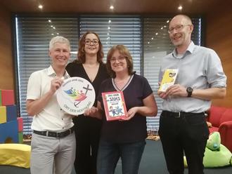 Stegaurach: Dem St. Michaelsbund der Erzdiözese Bamberg gehören rund 100 Büchereien an, so auch die Gemeindebücherei Viereth-Trunstadt. In einer kleinen Feierstunde wurden in der Bücherei Stegaurach durch den Abteilungsleiter Außerschulische Bildung des Erzbistums Bamberg, Christian Kainzbauer-Wütig im Beisein des 2. Bürgermeisters von Stegaurch Bernd Fricke, Pfarrer Sebastian Schiller und der Mitarbeiterin des St. Michaelsbundes in Bamberg Carina Christian eine Medaille und eine Urkunde „Ort der Hoffnung“ an verschiedene Büchereien des Landkreises vergeben. Als kleines Schmankerl erhielt jede Einrichtung auch ein handsigniertes Kinderbuch vom „Sams“-Autor Paul Maar.