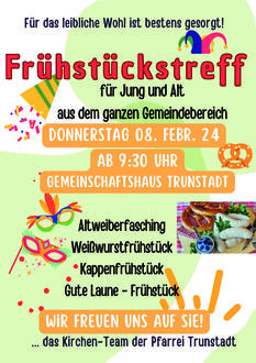 | 09:30 | Trunstadt | Frühstückstreff im Gemeinschaftshaus |