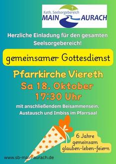 | 17:30 | Viereth | Gottesdienst zum 6.Geburtstag des SSB Main-Aurach - Herzliche Einladung an den gesamten Seelsorgebereich Main-Aurach! - siehe Extra Info |
