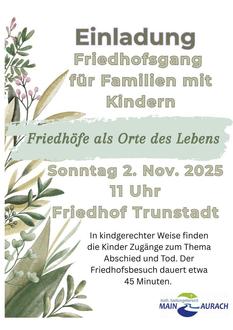 | 11:00 | Trunstadt | Friedhofsgang - Andacht extra für Kinder und Familien (Treffpunkt Friedhof - siehe Extra-Info) |