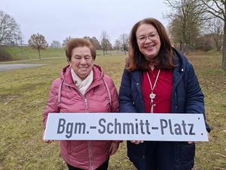 Anlässlich der offiziellen Anbringung des neuen Straßenschildes lud 1. Bürgermeisterin Regina Wohlpart die Ehefrau des verstorbenen Altbürgermeisters, Frau Elfriede Schmitt, zu einem gemeinsamen Ortstermin ein.
