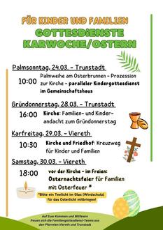 | 10:00 | Trunstadt | Treffpunkt am Osterbrunnen, dort Palmweihe, Prozession zur Kirche, anschl. Eucharistiefeier und parallel Kindergottesdienst im Gemeinschaftshaus |