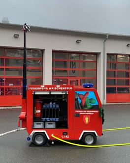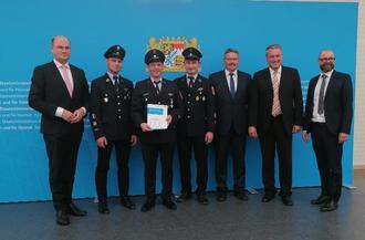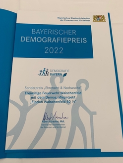 Herzlichen Glückwunsch der Freiwilligen Feuerwehr Waischenfeld zur Verleihung des Bayerischen Demografie-Preises durch Finanz- und Heimatminister Albert Füracker. Die Auszeichnung wurde am 8. Mai 2023 an die Erbauer des Kinderfeuerwehrautos "Florian Waischenfeld 40 1/2" Daniel Brand, Sebastian Söllner und Florian Huppmann im Heimatministerium in Nürnberg übergeben.