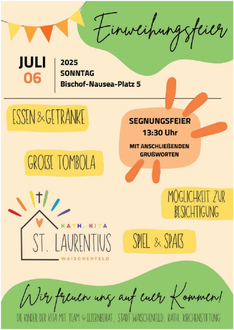 Am 6.Juli 2025 laden die Kinder, das Team, der Elternbeirat, die Stadt Waischenfeld und die Katholische Kirchenstiftung Sie alle recht herzlich zu unserer großen Einweihungsfeier auf den Schulhof (bei schlechtem Wetter in die Sport- und Bürgerhalle) ein.