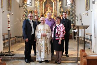 Der Jubilar Pfarrer Johann Götz, Dekan Ralf Heidenreich, Pfarrer Paul Robin Thekkath (Urlaubsvertretung), die Bürgermeister der Gemeinde Wald und Zell und PGR-Sprecher Josef Haimerl.