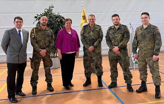 Bei einem Appell auf dem Schulhof der Grund- und Mittelschule Wald erfolgte im März die Übergabe der Dienstgeschäfte des Kompaniefeldwebels der 3./Versorgungsbataillon 4 von Oberstabsfeldwebel Martin W. an Stabsfeldwebel Robert A. Major Alexander S. würdigte in seiner Ansprache den beruflichen Werdegang von Martin W. Unter anderem war er bei einem Auslandseinsatz in Mali, seit 2022 war er Kompaniefeldwebel der 3./Versorgungsbataillon 4 am Standort Roding. In dieser Zeit war ein Teil der Kompanie in Litauen im Einsatz, Martin W. oblag es in dieser Zeit, die Umstrukturierung vor Ort in Roding zu organisieren. Bei vielen Terminen war er vor Ort in der Patengemeinde Wald, auch die Zusammenarbeit mit der RKK Roßbach/Wald war ihm immer ein wichtiges Anliegen. Ende März wird er nun seinen Ruhestand antreten.