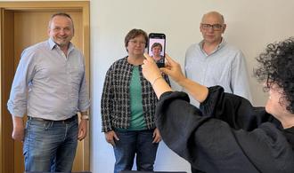 Bürgermeisterin Haimerl hat mit Bürgermeister Schwarzfischer und Geschäftsstellenleiter Held das neue System bereits getestet.