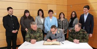 Dem Gelöbnisapelle folgte ein Empfang in der Gemeindehalle Wald. Dort wurde unter anderem den weitest angereisten Angehörigen ein Blumenstrauß überreicht. Weiter trug sich der Vertreter Kommandeur Panzerbrigade 12, Oberst Vollmann, der Kommandeur Versorgungsbataillon 4, Oberstleutnant Dr. Gößlbauer sowie der Kommandeur Logistikbataillon 472, Oberstleutnant Hildebrand in das Goldene Buch der Gemeinde Wald ein.