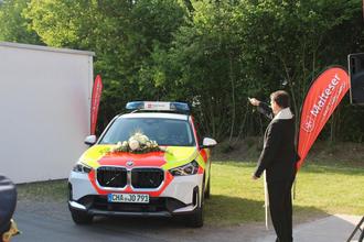 Pfarrer Heidenreich segnet das neue Einsatzfahrzeug