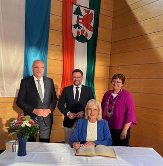 Bürgermeisterin Barbara Haimerl nutzte die Gelegenheit und bat die Ministerin um einen Eintrag ins Goldene Buch der Gemeinde Wald. Im Beisein von Landrat und Bezirkstagspräsident Franz Löffler und MdL Dr. Gerhard Hopp kam Ministerin Ulrike Scharf dieser Bitte gerne nach.