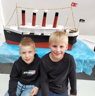 Unser Titanic-Projekt wurde fertiggestellt. Die beiden Jungs sind megastolz auf das, was sie da geschaffen haben. Es ist richtig gigantisch geworden. Damit es jeder besichtigen kann, haben wir es in einem Schaukasten in der Schulaula ausgestellt. Als Erinnerung haben jeder der beiden Buben ein laminiertes Foto bekommen.