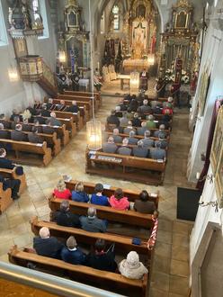 Nach einer kurzen Stärkung stellten sich die Ehrengäste, die Kapelle und die teilnehmenden Vereine zu einem kurzen Zug zur Kirche St. Laurentius auf. Dort erwartete Dekan Ralf Heidenreich die Gäste und begrüßte alle sehr herzlich. Pfarrer Heidenreich zelebrierte den Gottesdienst, die musikalische Umrahmung übernahm der Männergesangsverein Wald. Die beiden Bürgermeisterinnen trugen gemeinsam die Fürbitten vor. Am Ende des Gottesdienstes sangen alle gemeinsam „Wahre Freundschaft“.