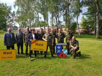 Während des Appells überbrachte Bürgermeisterin Barbara Haimerl die Grüße der Patengemeinde Wald. Sie zeigte sich davon überzeugt, dass es mit Blick auf den Ukraine-Krieg heute mehr denn je erforderlich bleiben wird, dass wir Soldatinnen und Soldaten haben, die unsere Sicherheit verteidigen, Frieden sei kein Automatismus. Haimerl wünschte den Soldatinnen und Soldaten und ihren Familien alles Gute für den Einsatz, von dem hoffentlich alle gesund an Leib und Seele wieder nach Hause zurückkehren werden. Haimerl übergab dem Kompaniechef der 3. Kompanie eine Ortstafel von Wald, welche auch in Litauen an die Verbundenheit und Unterstützung der Heimat erinnern soll.