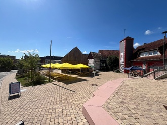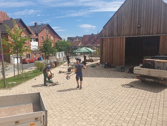 In der neuen Dorfscheune sitzt es sich zwar gemütlich aber auch draußen auf dem Platz lässt es sich schön feiern. Damit dies auch bei strahlendem Sonnenschein möglich ist, fanden sich einige freiwillige Helfer, die dort Bodenhülsen installierten, damit 5 Sonnenschirme künftig Schatten spenden.